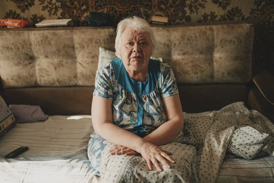 Женщина живет одна в небольшой квартирке аварийного дома. Старые деревянные рамы на окнах разбухли от времени и влаги. Потолок весь в подтеках.